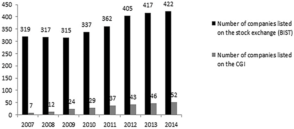 In this paper, we study the determinants of corporate governance rating scores in the Turkish case. Turkey is among the few emerging market economies that have adopted corporate governance measures in line with corporate governance regulations passed in other OECD economies. 1 The Capital Markets Board of Turkey (CMB) established the Corporate Governance Principles in 2005 and the Turkish Corporate Governance Index is published by the Istanbul Stock Exchange (renamed “Borsa Istanbul” since April 2013). Although inclusion on the index is optional, as of 2014 fifty-two Turkish companies are listed on the index representing 12.32% of all companies on Borsa Istanbul. It is expected that this number will increase as more Turkish companies will be included in the index.