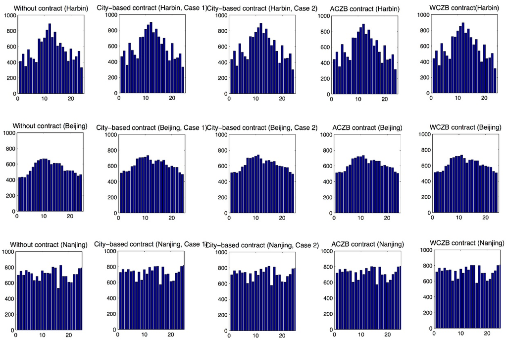 Figure 4 shows the values of VaRs under five situations, respectively without contract, with city-based contract (Case 1), with city-based contract (Case 2), with ACZB contract and WCZB contract (left to right), for each city.