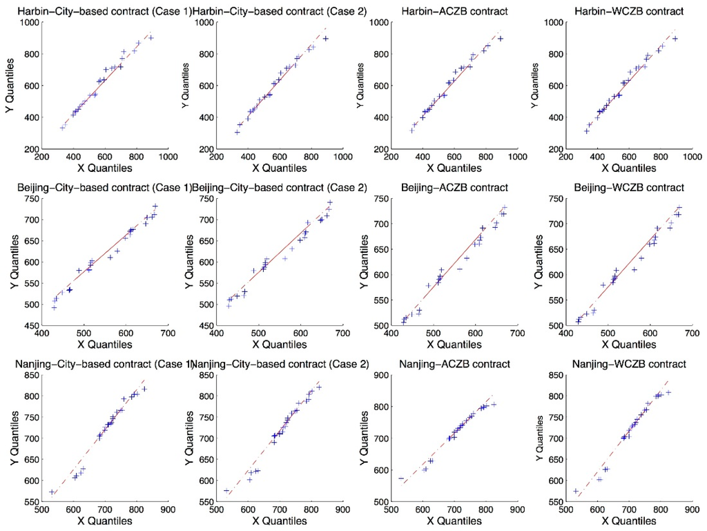 From the Q-Q plots, we conclude that the revenue distributions of Harbin and Nanjing are more right-skewed with GDD contracts while the revenue distributions of Beijing are more likely to be left-skewed with GDD contracts.