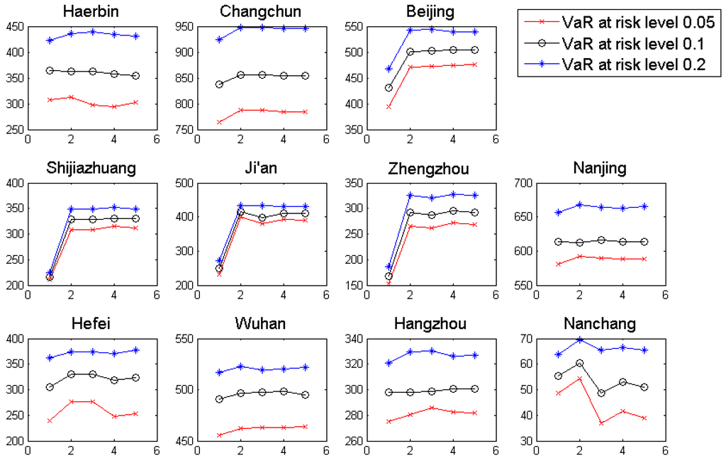 Further, different from the overwhelming superiority shown in the MRSL measure, climatic zone-based contracts show a slightly larger chance of failing in increasing the VaR compared with city-based contracts in Case 1. For city-based contracts in Case 2, three cities show negative impacts both at risk levels of 5% and 10% when climatic zone-based contracts are applied.