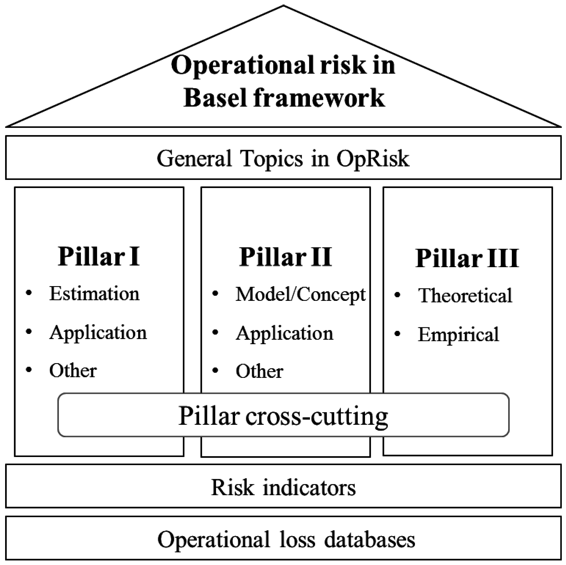 The rest of this paper is organized as follows. The research methodology and classification of articles are described in Section 2. Section 3 discusses the results of the classification of the operational risk literature into the three pillars of the Basel framework. Section 4 provides an overview of operational risk event databases applied in former research as well as those used by various financial institutions. Section 5 reviews the articles covering risk indicators based on business environmental and internal control factors, and Section 6 points out the gaps in research going beyond the Basel II/III requirements and summarises our main findings.