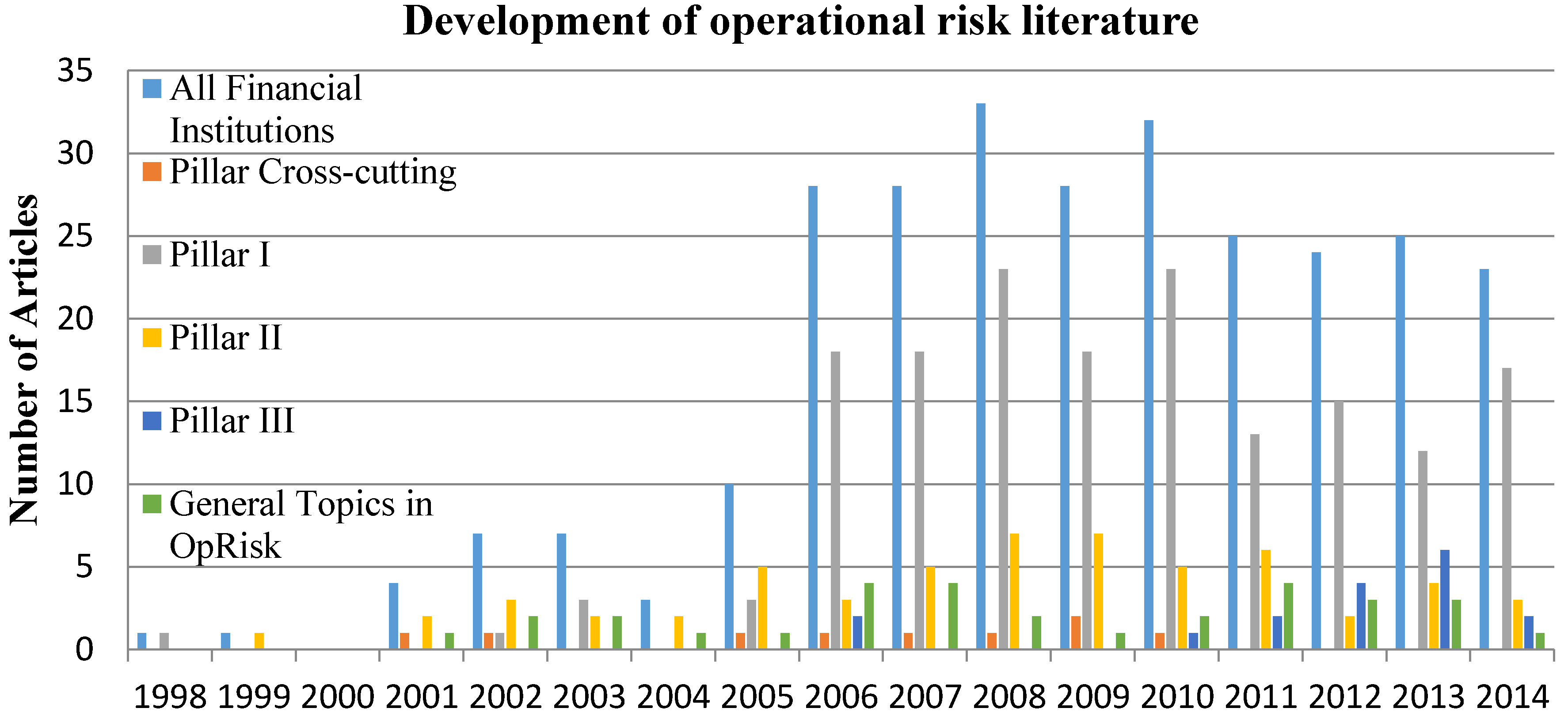 Second, we search for and select articles published between 1998 and 2014 because the first definition of operational risk, which is similar to the definition of the Basel Committee on Banking Supervision (2001)8, appears in a paper published by the Risk Management Sub-group of the Basel Committee on Banking Supervision in 1998 (see [13]). The earliest article in our sample “Modeling and Measuring Operational Risk” is by Cruz et al. [14], published in the Journal of Risk.9 Figure 2 shows the development of the literature on operational risk among financial institutions. The rapid growth in 2006 (almost twice that of the previous year) may be a result of a new regulation put forward by the Basel Committee on Banking Supervision, known as “International Convergence of Capital Measurement and Capital Standards” and published in 2006. Under this document, banks are required to hold capital for operational risk (see [1]).