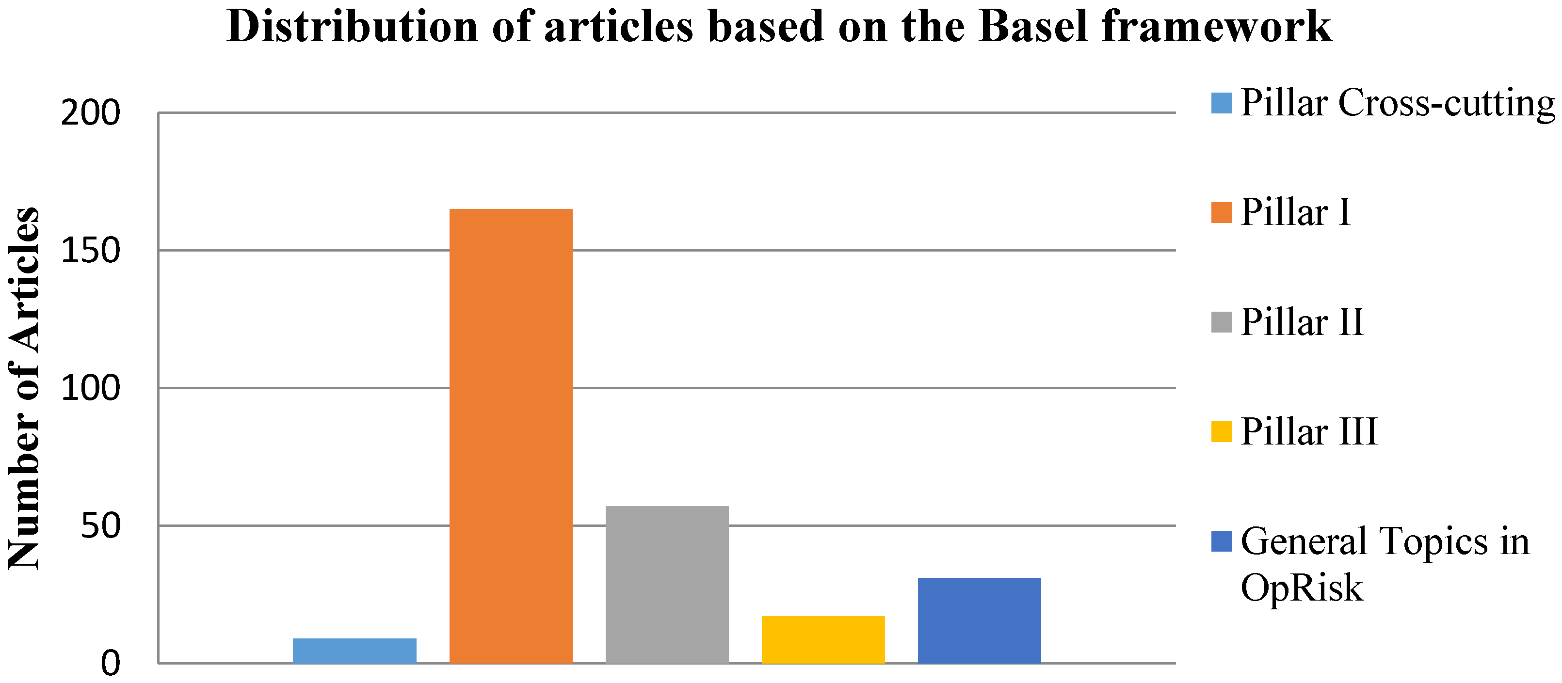Finally, the articles that cannot be exactly classified in one of the previous four categories are placed in a separate category called “General Topics in OpRisk”. This category comprises articles, such as that of Moosa [2], which examines and exposes numerous controversies surrounding the concept of operational risk, especially its definition and nature; that of Cope et al. [22], which analyses various regulatory, legal, geographical and economic factors that may influence operational loss severity; that of Chernobai et al. [23], which provides a comprehensive analysis of firm-specific and macroeconomic factors that determine the occurrence of operational risk events; and that of Hess [24], which analyses the relation between operational losses and financial crises, just to mention a few. However, one can argue that the latter articles can be classified in the “Pillar Cross-cutting” category, as these studies investigate factors that can be used on the one side by calculating regulatory capital under Advanced Measurement Approaches (AMA) put forward by the Basel Committee on Banking Supervision (Pillar I)11 and on the other side by developing better internal control and management practices (Pillar II).