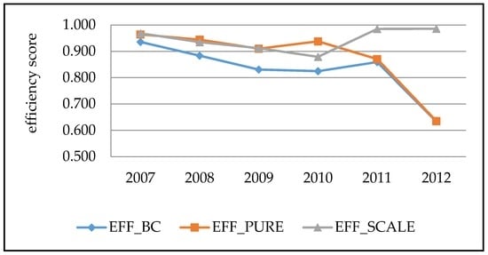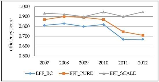 Similar results were found by Srairi and Kouki [] in GCC countries. By applying the DEA method on a sample of 25 GCC Islamic banks over the period 2003–2009, they confirm that the overall technical inefficiency of GCC Islamic banks is mainly attributed to pure technical inefficiency (29.3%) instead of scale inefficiency (17%). In a recent study, Aghimien et al. [] found that during all the study period (2007–2011), the sampled GCC banks (43 banks) were operating at an optimal scale of operation, which means that they were scale efficient. In addition, they showed that in the same period, GCC Islamic banks were managerially inefficient in exploiting their resources, which indicates that they suffer from pure technical inefficiency.