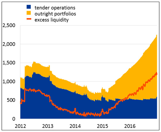 ECB monetary policy operations and excess liquidity (billions of euro). Source: ECB. Latest observation: 31 December 2016. Note: Tender operations include main, longer term and targeted longer term refinancing operations against eligible collateral; outright portfolios include public and private sector asset purchases in the market.