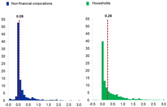 Distribution of deposit rates for non-financial corporations and households across euro area banks (x-axis: deposit rates in percentages per annum; y-axis: frequencies in percentages). Source: ECB. Observations refer to October 2016. Note: Deposit rates on new business as reported by individual banks. The dotted lines show the weighted averages of deposit rates.