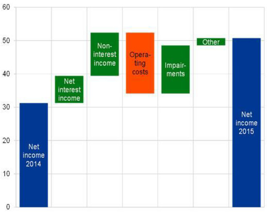 Change in net income of euro area significant banking groups (decomposition of change in net income between 2014 and 2015 in billions of euro). Source: SNL Financial and ECB calculations. Note: Based on data for a sample of 83 euro area significant banking groups.