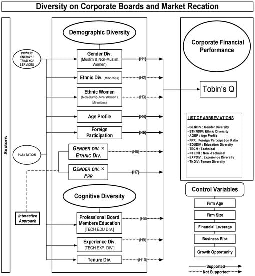 Diversified Corporate boards have a very significant impact on firm performance and firm value creation. As a result of this, wealth is maximised and this enhances stakeholder’s confidence. Demographic diversity has a positive impact on firm performance (, ). In contrast, researchers found that gender diversity among board members could result in a bad firm performance (). Women’s participation at the board level has a positive relationship with organisational performance. However, female board representation does not have any significant impact on firm performance as measured by Tobin’s Q, according to previous studies (; ; ; ; ; ). Ethnic diversity among the board of directors means that they can perform their responsibilities more effectively and efficiently (). There is ambiguity among previous research regarding diversity issues at the board level (; , ). There is less debate on the cognitive diversity of BODs, i.e., educational, experience diversity (). However, past studies used simple statistical tools and techniques to investigate the diversity issue. There is a need to investigate the diversity issue in a more holistic way by using different sample sizes and sampling techniques (). Empirical studies showed that there is a strong correlation between demographic and cognitive diversity and firm performance (). It is a keen interest for many researchers to explore demographic and cognitive diversity with regards to firm performance. This paper focuses on investigating diversity at the top level of management of large companies with regards to their firms’ value (Tobin’s Q). This study tries to fill the gaps in diversity literature related to board directors as, to the best of our knowledge, this is the first study which investigates demographic and cognitive diversity simultaneously with a variety of diversity dimensions. Hence, the purpose of this study is twofold. First, this study aims to examine diversity among board members and firm performance. Second, this paper discusses empirically diverse corporate boards with the interaction approach and its impact on the firm performance. This study focuses only on Malaysian listed companies maintaining a homogeneity factor because Malaysia is a highly rich diverse country. This research contributes to the literature in several ways. First, this study shows the cognitive diversity among board members and its impact on firm performance. Second, we used the interaction approach to investigate the diversity issue more holistically. Third, this study employed a combination of different hypotheses that are not well explored in the literature. Fourth, we extend previous research, mainly focused on cognitive context. Finally, this study, as far as we know, is the first study with detailed diversity constructs and using market performance (Tobin’s Q). The findings from the diversity at the board level with regards to firm performance have significantly positive and negative results. The interaction approach is very positively significant with firm performance. Foreign participation diversity with gender diversity has a positive and significant impact on firm performance. Hence, foreign participation at the board level can enhance the profits and perhaps improve the internal operations of their companies. Women can perform better on corporate boards if they work with the foreigners on board. The more diversified a board is, the higher the firm performance will be.