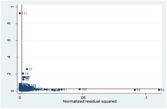 Cook’s distance outlier test is used to measure the information of leverage and residual of the observation. Figure 2 is showing that there are some outliers, which are not consistent with the data. After deleting these problematic companies, some cases have large residuals (i.e., the difference between the predicted and observed value for cases are exceptionally large), but some cases do not have much leverage. Therefore, we can conclude that our panel is in smooth form after deleting these cases. [Number of obs. = 625m, F (15,609) = 7.47, Prob. > F = 0.0000].