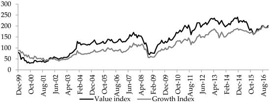 The indexes used for comparing the performance of value versus growth stocks in the Thai market were the MSCI Thailand Value Index and the MSCI Thailand Growth Index. All the data were extracted from the database Bloomberg. The end of month value for both indexes were collected for the period from December 1999 to December 2016. The risk free rates for Thailand for all these years were extracted from Bloomberg and equate to the 10 year local treasury bond yield (longest time series available in the data base). For the previously mentioned period the value index generated returns of approximately 156% while the growth index generated a return of 120%. The MSCI indexes are frequently used as benchmarks by actual institutional investors in this market. It seemed reasonable then to use these indexes, rather than creating an artificial basket of stocks representing value and growth investments. In the indexes used, there is no double counting, in other words, there are no companies included simultaneously in the value and the growth indexes.