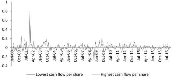 Portfolios were also created using the cash flow per share metric. Similarly to the previous case a list of the companies listed in the Bangkok Stock Exchange at the end of December 1999 was used as a starting point. Then the cash flow per share was extracted from the data base Bloomberg for each of those stocks and arranged into four buckets. Only companies with positive cash flows were included. Due to these limitations, only 50 companies were left on the overall list. The top and bottom buckets contained 12 companies each. The returns of the indexes created using this criteria can be seen in