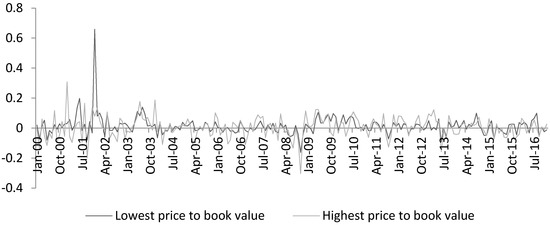 A third approach used to construct portfolios was to use the price to book value metric. Like in the previous cases, the starting point was the list of companies listed in the Bangkok Stock Exchange as of the end of December 1999. Then the price to book value metric was obtained from Bloomberg for each of the companies and arrange accordingly. The top and bottom buckets each contained 14 companies. Low price-to-book value is typically associated with value investment strategies while high price-to-book value is normally associated with growth stocks. The returns of the indexes created using this criteria can be seen in