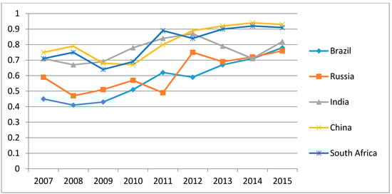 In this Equation (1), TC is the dependent variable and represents total cost. TC is defined as the sum of total interest and operating expenses. We follow the intermediation approach, and for inputs and outputs, we specify input prices (P) as the price of labor (PL), the price of fixed assets (PF), and the price of funds (PF)2, and outputs (Y) as total loans (TL) and other earning assets (OEA) (Zheng et al. 2017a). The graph below (Figure 1) shows the annual average cost efficiency scores of all banks within each sample country. With short-term fluctuations, the overall trend of bank efficiency in BRICS countries is upward sloping.
