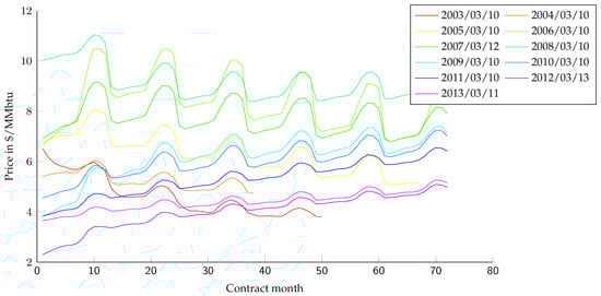 In what follows, will denote the spot price of natural gas at date t, and represent the futures contracts prices at t, for a set of maturities. We consider monthly spaced maturities, so every futures contract is related to a delivery month. Also, we denote by the price of prompt contract, i.e., the futures contract with the closest maturity to current time t. Natural gas prices are quoted in U.S. dollars per million British thermal units (MMBtu).
