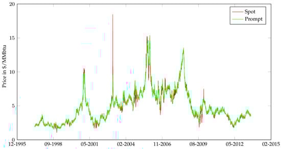 The second important aspect of natural gas prices is the presence of sudden moves due to unexpected imbalances between supply and demand, caused by such factors as unpredicted weather changes, disruptions in the supply chain, or poor anticipations of the global amount of gas in storage. Such events are almost instantaneously reflected in the spot dynamics, resulting in large price swings that are rapidly absorbed, however, by the storage capacities available in the market. These large and quickly absorbed jumps, commonly called spikes, can be viewed in Figure 2, which shows many sudden dislocations between spot and prompt prices.1 For example, we can notice a large spike in the spot price during late February 2003, when the natural gas price jumped by almost and in two successive days, then went down by and during the two following days. As noted by the US Federal Energy Regulatory Commission (), this spike in gas price was due to “physical market conditions leading to low supply and high demand for a short time.” The author also observed that “similar natural gas price spikes are possible when episodes of cold weather occur at times when storage inventories are limited”.