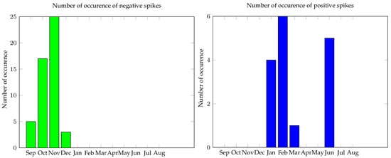 In our study, we detect spikes by identifying the outliers from the time series of the spread between the spot price and the prompt price given by ; we study separately the positive and negative spikes, since they reflect different market conditions. Positive spikes are often caused by unpredicted weather changes, such as a cold front or a heat wave. On the other hand, negative spikes are generally due to a poor anticipation of market-wide gas storage levels. In Figure 3 we plot the number of occurrences of negative and positive spikes during each month. We remark that the distribution of spikes is clearly dependent on their sign: most of the positive spikes happen during the winter months of January and February and the summer month of June, which can be explained by the occurrence of an unpredicted cold front or heat wave. On the other hand, negative spikes appear during the Fall. One plausible explanation is given by (), which states: “October is the last month of the refill season. There may be increased competition from storage facilities looking to meet end-of-season refill goals as well as increased anticipation regarding the upcoming heating season”.