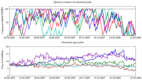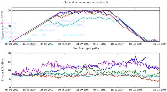 As previously mentioned, seasonal spreads have become narrower these last years, which means that the bulk of a gas storage value is extrinsic, and needs to be extracted by trading the spread between the spot price and prompt. It is, therefore, important to look closely into the spot modeling and its effect on storage valuation and hedging. We believe that the uncertainty surrounding storage value is primarily due to the modeling of the spot process, since it is the evolution of the spot process ((17) and (19)) that by and large determine the optimal trading strategy. In turn, the futures model mostly affects the quality of the hedge or variance reduction, not the expected value of the storage unit. At least another author () reaches a similar conclusion while using the rolling intrinsic valuation method.