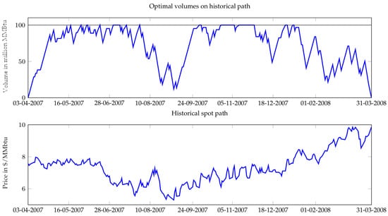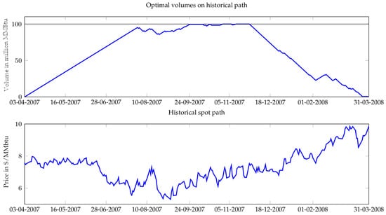Historical spot path and optimal volumes (fast storage). bottom panel: historical path, top panel: the optimal storage level on the historical path.