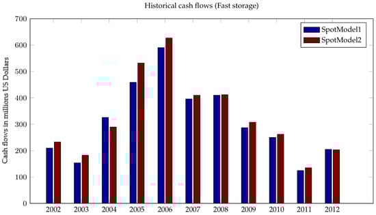 Historical cash flows for spot models 1 and 2 (fast storage).