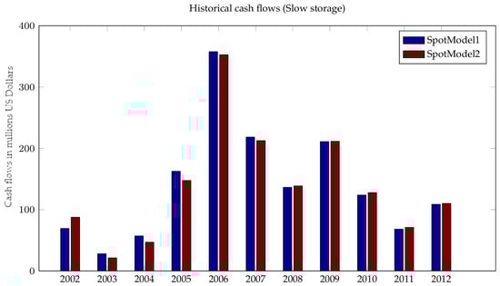 Historical cash flows for spot models 1 and 2 (slow storage).