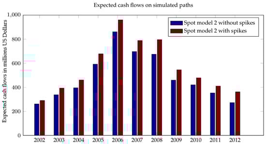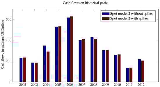 We run the valuation procedure explained in Section 4, using the two spot models, over a testing period starting in 2003 till 2012. For each year, we compute the actual performance of each model; in particular, we report in Figure 8 and Figure 9 the cumulative cash flows using the optimal spot strategy for historical spot and futures trajectories.