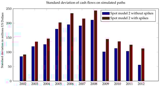Figure 10 represents the expected cumulative cash flows of a fast storage unit, on simulated paths under spot model (19). All the test periods show that modeling the spikes in the spot dynamics gives a larger extrinsic value for the storage unit, but at the same time it introduces a larger standard deviation for the cumulative cash flows, as illustrated in Figure 11.