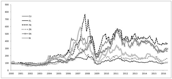 Plot of base metal prices (normalized by their January 2000 value).