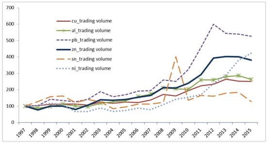 Plot of base metal trading volume (normalized by their 1997 values).