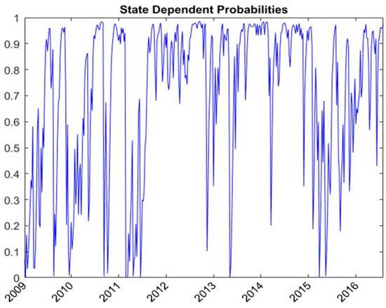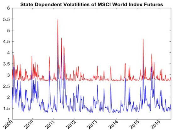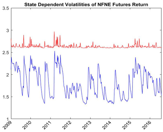 The spillover equation shows the parameter estimates of the volatility dynamic of MSCI world index futures and the spillover factors and . Figure 4 shows the state-dependent volatilities of MSCI world index futures. The average volatilities are equal to 1.862 and 2.92 in the low and high volatility states, respectively. The state-dependent volatility spillover ratios defined in Equations (16) and (17) measure the state-dependent proportion of the variances of domestic markets caused by the volatility spillover from global market shocks. The state-dependent spillover ratio is a function of spillover factors, the volatility of domestic market, and the volatility of MSCI world index futures. Figure 5 and Figure 6 show the state-dependent volatility spillover ratios of textiles spot and NFNE futures, respectively. The average volatility spillover ratios are, respectively, 0.409 and 0.275 for textiles spot in the low and high volatility states and are, respectively, 0.469 and 0.540 for NFNE futures in the low and high volatility states. The volatility spillover from the global market is higher in the NFNE futures than in the textiles spot for both regimes.
