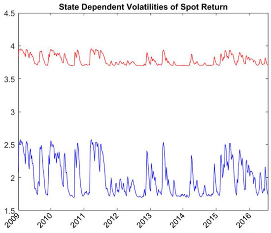 According to Equations (8) and (9), under the assumption of no correlation between the normalized idiosyncratic shocks in domestic stock sector index and global stock index futures or between the normalized idiosyncratic shocks in domestic stock index futures and global stock index futures, the state-dependent conditional variances of domestic stock sector index and domestic stock index futures returns are given by