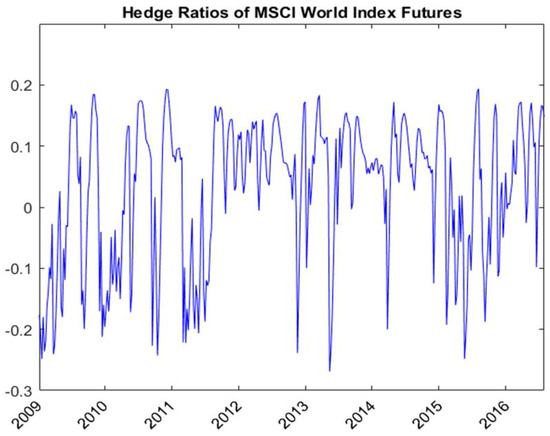 Table 4 shows the out-of-sample hedging effectiveness of RSVSG. RSVSG captures the effects of both global volatility spillover and regime switching and hedges the spot exposures using both NFNE and MSCI world index futures. Figure 7 and Figure 8 respectively show the hedge ratios of NFNE futures and MSCI world index futures for textiles estimated with RSVSG. Taking the textiles sector, for example, the variance of the unhedged spot position is equal to 6.745. When we apply the state-independent bivariate BEKK hedging strategy using only NFNE futures, the variance is 2.966—a variance reduction of 56.03%. If we take into account the volatility spillover effect from MSCI world index futures to domestic textiles sector and NFNE futures using a state-independent volatility spillover (VSG) model, the variance is 2.946—a variance reduction of 56.32%. Applying MSCI world index futures for hedging textiles spot exposure improves the hedging effectiveness. VSG is superior to BEKK for textiles, retailing, transportation, and communication and internet, but inferior to BEKK for automobiles and for plastics and chemicals. When we consider the effects of both volatility spillover and regime switching using both NFNE and MSCI world index futures, the variance of the hedged portfolio return by applying RSVSG is 2.930. The improvement by RSVSG in percentage variance reductions is 0.53% and 0.23% compared with the VSG and BEKK models, respectively. The incremental utility gains of RSVSG over VSG and BEKK are 0.135 and 0.053, respectively. Since most of the utility gains are positive for the data considered, hedging the stock sector exposure with additional MSCI world index futures under regime switching improves hedging effectiveness.