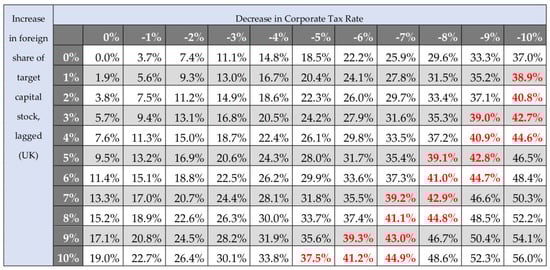 Figure 1 shows hypothetical combinations of changes in the statutory corporate tax rate which would be necessary to neutralize the combined effects of a hard Brexit (no EU single-market membership) and the various cases of an assumed increase in the foreign share of the target capital stock (for example, due to increasing M&A activities for 2015–2020). We have highlighted in red the required policy action in the sense of reducing the UK statutory corporate tax rate. As can be seen from the table, a given foreign share in the UK capital stock would require a reduction of a corporate tax rate by 11% to offset the BREXIT decision (interpreted here as losing access to the EU single market). If, for instance, the increase in the foreign share of the UK capital stock, driven by a real pound devaluation, would be 5%, the corporate tax rate would have to decrease by 8% in order to neutralize BREXIT in the long run.