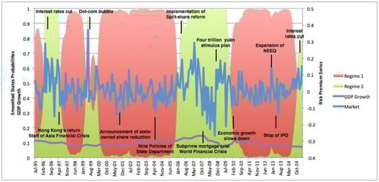 Though past studies have tried to combine the multi-factor model with a regime switching framework, none of them have systematically investigated the time-variations in both, risk factors excess returns and risk loadings (known as betas). It is also vital to make comparisons among major asset-pricing models. Last, but not least, few researchers have investigated the time-varying risk-return relationship in the Chinese stock market. As the Chinese economy has had tremendous growth during the last 30 years, it has become one of the biggest markets in the world. Along with its economic growth, the Chinese financial market is also growing fast and has played an important role in the Asian-Pacific area. However, unlike other important stock markets, the Chinese stock market still faces serious problems that have been caused by the dual economic system, restrictions on foreign currency conversion, government interventions, and information asymmetries. Since the Chinese stock market is immature, highly restricted, and less inclusive, it is driven more by liquidity and speculative sentiment, rather than by economic fundamentals. That is why China has spent more than half of its time in a bear market, which has also been confirmed by our results. On the other hand, a bull state occurs from time to time, along with interventions by the government. Every time the government tries to “stabilize” a market or issue new policies, it brings a short period of prosperity dominated by irrational retail investors and speculators. As Brunnermeier et al. (2017) show in their theoretical model, although government intervention helps stabilize such an unregulated market, it also amplifies the effects of policy errors and worsens informational efficiency. Based on their predictions, we expect that the validity of equilibrium models may be distorted during some periods when pricing errors are increased by noise factors. Moreover, since Lin et al. (2012) and Guo et al. (2017) point that Fama-French factors can proxy the latent risk factors in the Chinese stock market, we focus on the two typical asset-pricing models (i.e., CAPM and Fama–French three-factor model) and put them under Markov regime switches. It was found that the Chinese stock market can be depicted with two regimes in which the multi-factor asset-pricing model deviates from one to the other. Hence, investigations on the features of the Chinese stock market, and the portraits of time-varying risk factors and betas, are of great significance to investors.