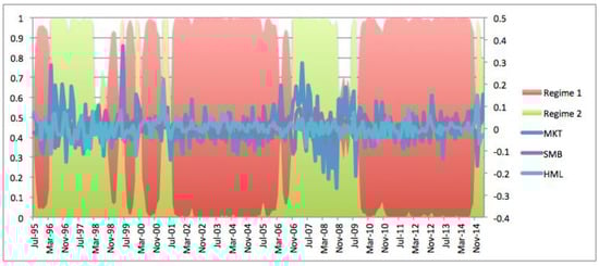 To better understand how the risk-return relationship deviates, we put the traditional Fama–French three-factor model in the framework of Markov regime switches. We first analyzed how risk factors vary as regime switches. Figure 3 plots the time-series variations of risk premiums on MKT, SMB, and HML. The red and green areas denote the smoothed probabilities of a bear market (regime 1) and a bull market (regime 2), respectively. It was shown that a bear market dominated most of the observation period. According to the estimates in Table 3, if the current state is a bear market, the probability of staying at the current state is as high as 0.95. Further, since the probability of transmitting from bear to bull is 5%, lower than the probability of transmitting from bull to bear (11%), it is more likely to be a bear market, whose expected duration is as long as 18.89, almost twice that of a bull market.