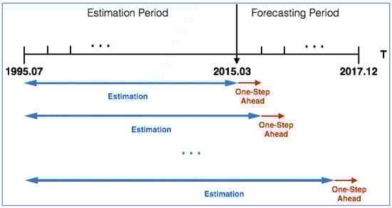 Figure 7. One-Step-Ahead forecasting of an MR-FF3 model. Notes: The figure illustrates the expanding estimation window and the forecasting window of an out-of-sample analysis for an MR-FF3 model.