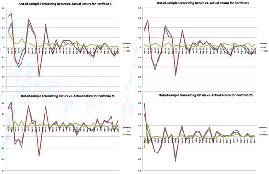 Figure 8. Out-of-sample forecasting return vs. actual return for each portfolio. Notes: The figure depicts the one-step-ahead, out-of-sample forecasting returns (red line) and actual monthly returns (blue line), during the period from April 2015 to December 2017 for the 1st, 5th, 21st, and 25th of the Fama–French 25 portfolios (P01, P05, P21, P25).