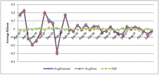 Figure 9. Average out-of-sample forecasting return vs. actual return. Notes: The figure depicts the one-step-ahead, out-of-sample forecasting returns (denoted by Avg Forecast), actual monthly returns (denoted by AvgTrue), and their differences (denoted by Diff), during the period from April 2015 to December 2017 for the Fama–French 25 portfolios.