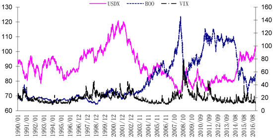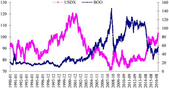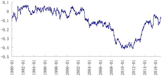 Figure 2 shows the movement of dynamic condition correlation between Brent oil and US Dollar index, and the correlation coefficient is time-varying. Prior to 2002, the DCC coefficient fluctuated around zero, and the fluctuation range was concentrated in [−0.1, 0.1] range. This describes that within this period, the correlation is relatively low. From 2002, a negative relationship has been established, DCC coefficient dropped from 0 to around −0.15 in 2002–2004, and maintained at about −0.20 until July 2008. There was a significant decline since August, 2008, which dropped to below −0.4 by 2009, and fluctuated between [−0.30, −0.45] before June 2013. After June 2013, the correlation coefficient increased sharply and tended to zero, and the negative relationship weakened significantly. Overall, since 1990, the relationship between oil and the dollar is time-varying, experiencing a “very weak correlation—negative correlation—enhanced negative correlation—weakening negative correlation” process.