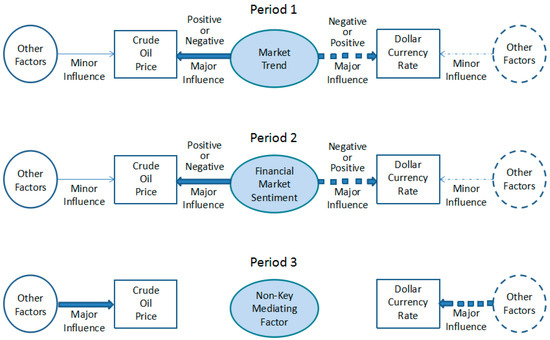 Our empirical results further confirm that even if the sample period is extended to the period after financial crisis, the relationship between crude oil prices and the dollar is time-varying, which is consistent with previous literatures (Wu et al. 2012; Reboredo et al. 2014; Coudert and Mignon 2016). However, since the previous studies did not provide adequate explanations to why the correlation is time-varying, this paper proposes a hypothesis of ‘key mediating factors’. We believe that: (1) although the price of crude oil and the dollar are influenced by different factors, such as monetary policy of United States and the EU (Anzuini et al. 2012; Ratti and Vespignani 2016), the global overall demand (Kilian 2009), OPEC and non-OPEC oil production (Demirer and Kutan 2010; Golombeka et al. 2018), the inventory of crude oil and petroleum products (Bu 2014; Kilian and Lee 2014), price of alternative products such as shale oil (Killian 2016; Behar and Ritz 2017), geopolitical events that influence the price of crude oil (Martina et al. 2011; Karali and Ramirez 2014; Chen et al. 2016), financial market or investor sentiment (Tang and Wei 2012; Qadan and Nama 2018), in a certain period, there exist a ‘key mediating factor’ that has a significant impact on both US dollar exchange rate and crude oil price simultaneously, and in the opposite direction, making the two demonstrate a negative relationship. As the impact of the ‘key mediating factor’ is time-varying, leading the correlation between the two strong or weak in different periods; (2) key mediating factors in different periods are not the same; (3) in some period, there is no such key mediating factor, in such a case, the fluctuation of the two assets price is mainly driven by individual factors, resulting in a weak correlation. The specific mechanism is shown in Figure 3.