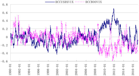 In contrast with the dollar, relationship between VIX and oil prices is negative significantly. When the market panics rose, the oil prices fell; and when the market panics eased, the oil prices rose. This is mainly due to two reasons: first, after the financial crisis, the rising or falling of market panics reflects the pessimistic and optimistic sentiment of market towards future macro-economy. Future macroeconomic deterioration or improvement will reduce or increase oil demand, leading to a decline or rise in crude oil price; second, after 2000, the financialization of commodity markets (including crude oil) grows fast. The price of oil and other commodities are mainly determined by financial markets, especially by futures markets (Tang and Wei 2012; Cheng and Wei 2013), financial investment and speculation has become an important factor in oil prices. Market panic will lead investors to short oil assets and invest in safe assets. When the market calms and investors’ risk appetite strengthens, market investors tend to sell safe assets and buy oil assets, leading oil prices to rise. These two forces combined together, making a negative correlation between the oil price and VIX index. Furthermore, Figure 5 shows the dynamic correlation coefficients between the VIX index calculated by the above DCC-GARCH method and the US dollar index and crude oil price respectively.