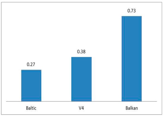 This result does not contradict the fact that the average values of efficiency (calculated by net interest margin as output) of banking systems CEE were the highest in Balkan countries (0.67); followed by Visegrad Countries (0.385); and Baltic countries (0.25). This may indicate that banks in Balkan countries had a higher net interest margin connected with weak openness of market, related to the fact that businesses have fewer opportunities to draw loans from abroad; this may be related to currency risk, which is included in the prices of products.