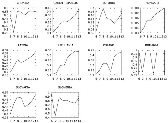 () investigated the impact of the European Union integration process on banks’ efficiency and the convergence of cost efficiency across banking systems from Central and Eastern European countries from 2004 to 2010. They observed large differences in the level of cost efficiency between national banking systems and noticed an increase in banking efficiency for all banking systems until 2008. They investigated the convergence process in determination by an increase in the average efficiency level of less efficient banking systems. The convergence process can also be determined by the decrease in the average efficiency level of the banking systems known as the “lagging-behind” process.