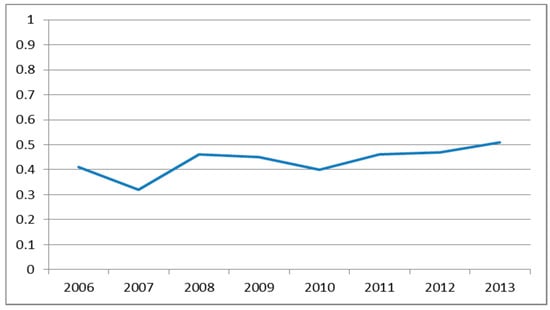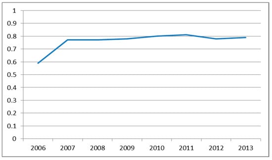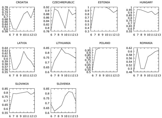 Average Efficiency1 banks in CEE countries. Source: Author’s own processing. The years on the x-axis are marked as follows: 2006 as “6”, 2007 as “7”, 2008 as “8”, 2009 as “9”, 2010 as “10”, 2011 as “11”, 2012 as “12” and the year 2013 as “13”.