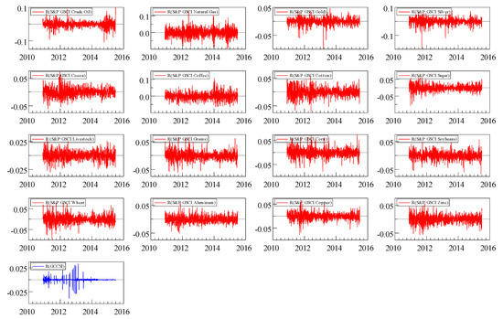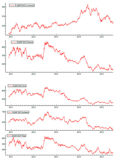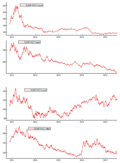We use the log returns of daily spot prices for 16 commodities derived from the Dow Jones Commodity Index over the 23 November 2010–28 August 2015 period to assess the dynamic linkage between sukuk and commodity markets. Spot returns are the main drivers of the variation in commodity returns over short-term horizons, whereas rolling returns (annualized average returns) are crucial factors that contribute to commodity excess returns over longer-term horizons (Nagayev et al. 2016). The S&P GSCI is the first major investable commodity index. It is one of the most widely recognized benchmarks that is broad-based and production weighted. The indices include the precious metals commodity index (gold (GOLD) and silver (SILV)); the energy commodity index (crude oil (COIL) and natural gas (NGAS)); the soft agriculture commodity index (cocoa (COCO), coffee (COFF), cotton (COTT), sugar (SUGA), grains (GRAIN), livestock (LIVE), corn (CORN), soybeans (SOYB) and wheat (WHEA)), and the industrial metals commodity index (aluminum (ALUM), copper (COPP), and zinc (ZINC)). The diversity of commodities used in this study offers potential insights into the exposure of sectors in determining the risk and return of sukuk indices. Figure 1 plots the time variation of the various commodity indices, including soft commodities, precious metals, industrial metals and energy indices. We can see some periods of significant price fluctuations, but price development patterns are different for most of the commodity indices.