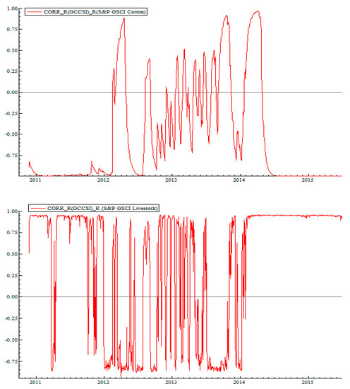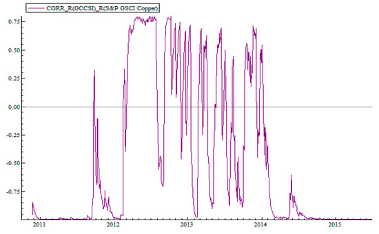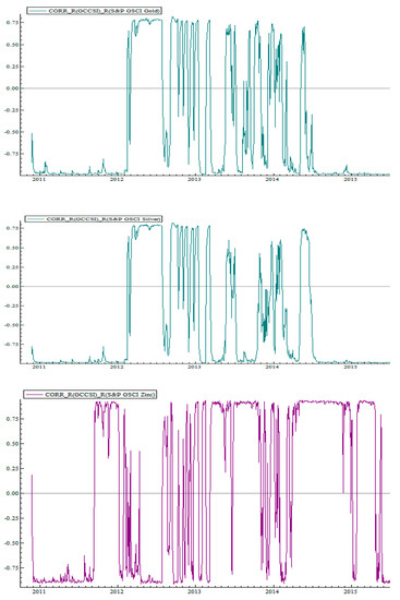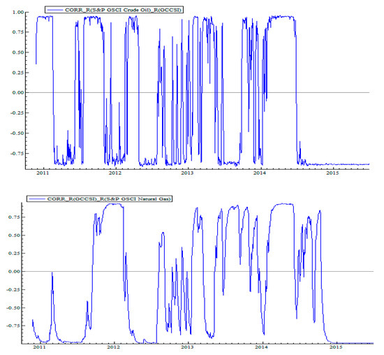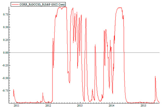The parameters of the model and the diagnostic tests are given in Table 3. We notice that the ARCH parameters are statistically significant and satisfy the non-negativity condition set for the conditional variance. Based on the goodness-of-fit tests (Li–McLeod and Hosking tests computed with 20 lags), the results indicate no serial correlation and no remaining ARCH effect, demonstrating no evidence of statistical misspecification. Therefore, the data set fits the model specifications very well; thus, the derived dynamic conditional correlation series can provide a reasonable inference about the evolution of correlations over time. In addition, the findings in Table 3 suggest a negative correlation among sukuk returns and the commodity indices. Figure 4 and Figure 5 plot the estimated dynamic conditional correlations (DCC) between the GCC sukuk and commodity indices.