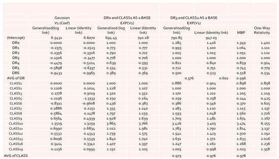 The relativities are obtained by selecting kth levels as a base, which are defined as , for DR, and , for Class.