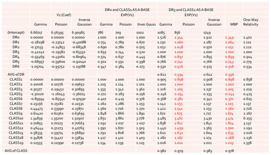 The results obtained by using other error distributions, including gamma and inverse Gaussian, are presented in Figure 2. The estimates of relativities for both DR and Class were larger than the ones obtained from MBP or Poisson distribution. The MBP and Poisson distribution led to the same theoretical results—see Brown (1988). This may mean that the use of a heavy tail distribution in an error distribution function gives larger estimates of relativities. Risk increased when the tail of the loss distribution was heavier, resulting in larger relativities for the rating factors. When the relativities obtained from GLM or MBP were compared to one-way relativities, we saw that they were mostly underestimated. This suggests that more risk factors may need to be included in order to better capture data variation. Rate filings reviews do not aim at pricing, but focus instead on producing results that help to better understand the nature of major risk factors used by companies.
