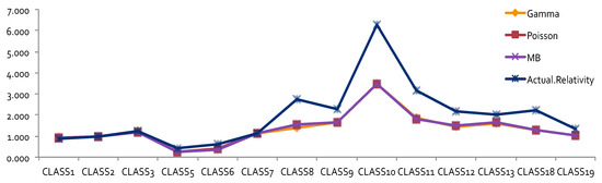 The results of relativity estimates and their comparisons under different model assumptions are reported in Figure 3, Figure 4, Figure 5 and Figure 6. In Figure 3 and Figure 4, the overall pattern for DR was consistent for all cases. Relativity decreased with the increase of the number of non-accident years. This means that prior driving record proved to have validity in predicting a driver’s accident risk. This result coincides with the results of in Peck (1983), who demonstrated the significant predictive power of DR as a rating factor. In all cases, the relativities of DR obtained from GLM were close to the actual relativities calculated from the one-way summary. For Classes 1 to 7, which contained the majority of the risk exposures, the estimated relativities for all considered models were close to the actual one-way estimates. The model estimates’ departure from the actual one-way relativities became significant only for those Classes that contained a smaller number of risk exposures. The values of the coefficients and relativities of the considered methods are displayed in Figure 7. Overall, these values coincided with the actual values, but GLM underestimated the relativities at some levels of Class—namely, Class8, Class10, Class11, and Class18. We believe that this is due to both the missing values and the level of credibility of data from those classes. Combining Class with DR, we were able to see that Class was successful in explaining the loss cost data. A similar research outcome was reported in Lourens (1999). Unlike a single class with multiple characteristics as in our work, drivers’ sex, age, and level of education were used in Lourens (1999).
