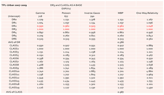 From the results displayed in Figure 8 and Figure 9, we can conclude that the model with as a risk factor was a good choice from the rate filings review prospective, as it could avoid extra uncertainty from single-year data. The results from the data of three years combined were more reliable and more suitable for acting as a benchmark for the rate filings review. The model can be easily extended to further include the territory as additional risk factor. However, we feel that from the rate filing review perspective it is not necessary, because it will significantly decrease the number of exposures for each combination of given levels. Also, we found that the definition of territory presents another difficulty, as it may change from time to time. Definitions of DR and Class are relatively more stable.