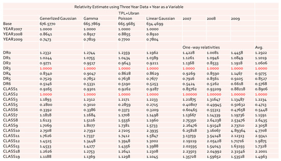Relativities obtained under GLM with log link function and various error functions including gamma, Poisson, and inverse Gaussian. The combined data of three accident years’ loss cost were used.